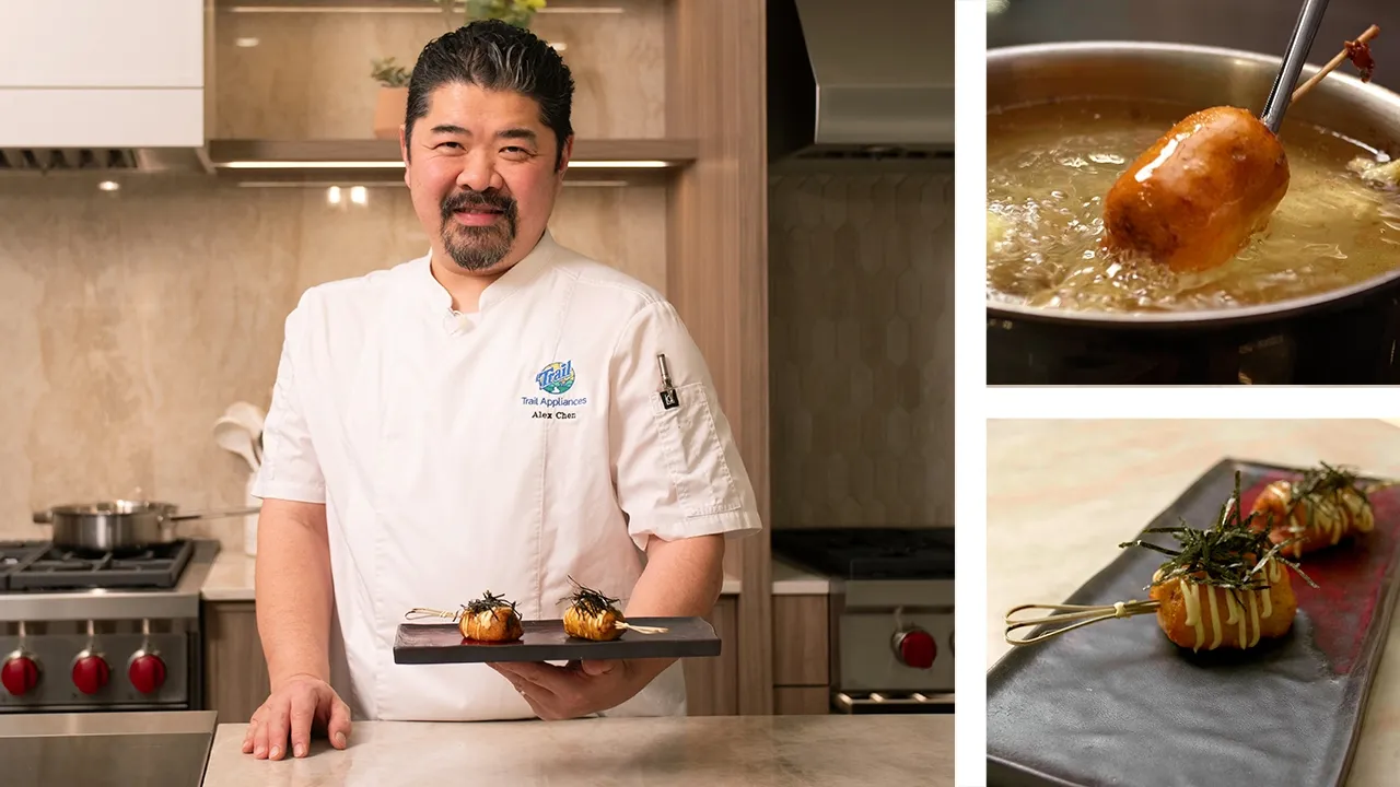 The newly renovated Sub-Zero / Wolf / Cove display kitchen at the Trail Appliances Richmond Showroom, designed by SSDG Interiors Inc. is where Chef Alex brought this dish to life. A recipe that moves through blanching, steaming, and deep frying demands a kitchen that can keep pace — and here, select appliances are live, fully operational, and purpose-built for exactly this kind of cooking and to inspire possibilities for your dream kitchen.