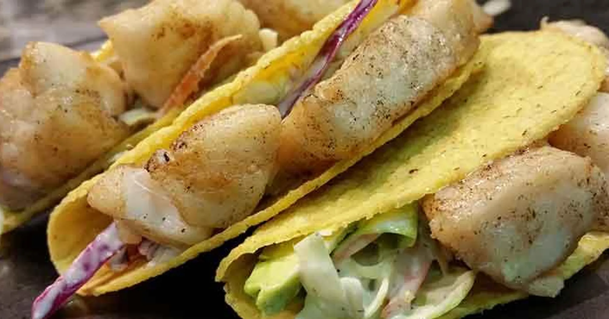 When fish is cooked and shells are hot, line the shell bottoms with the chopped avocado, then a layer of the coleslaw mix, then top with slices of the cooked fish fillet. Serve hot.