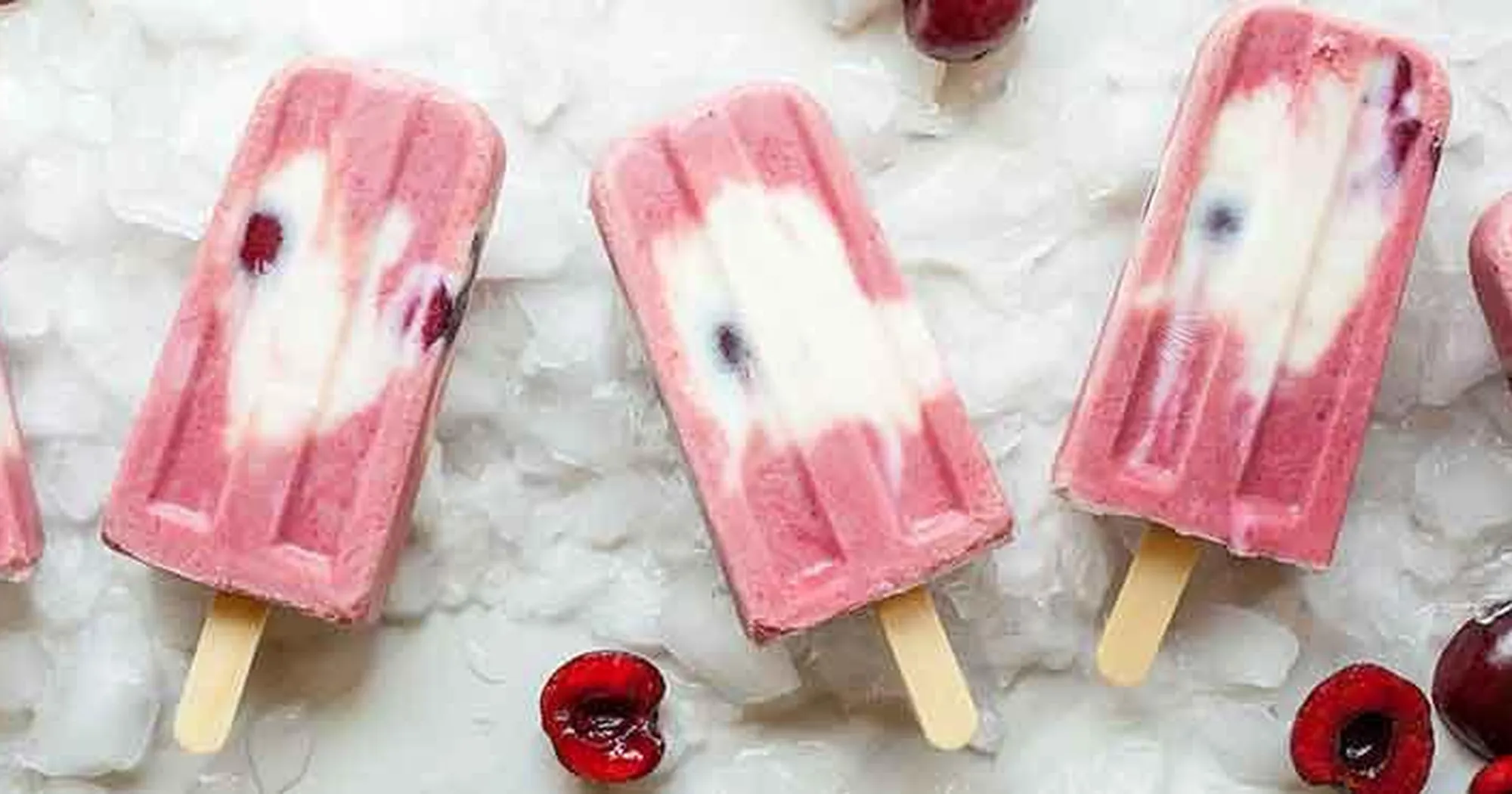 Pour one flavour into the mold. Add a few cherries (if using) then freeze fully before adding the second flavour. Several types of mold kits are available to make adding the sticks easier.