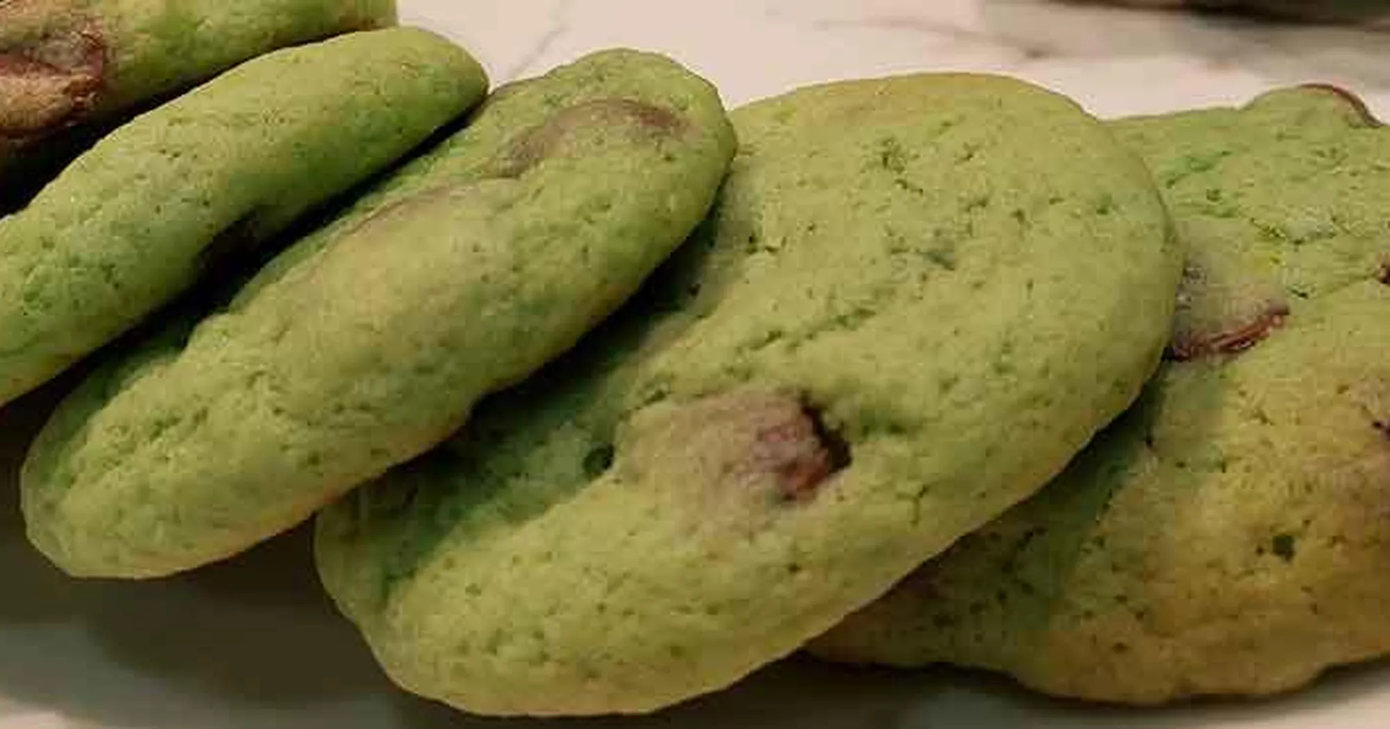 Ingredients2 cups flour½ cup vanilla pudding mix (dry)½ tsp baking soda½ tsp salt½ cup butter softened1 cup white sugar1 egg½ cup sour cream1 tsp mint extract10-12 drops green food colouring1 ½ cups chocolate chips