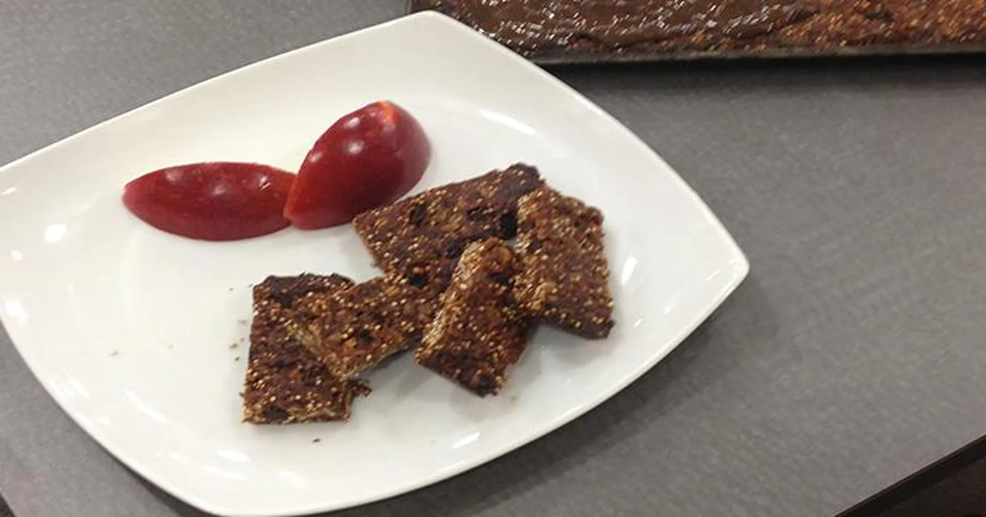 Bake on convection bake at 325F for approximately 20 minutes. When almost finished it will start to pull away from the sides of the pan. Let it cool before slicing into bars.