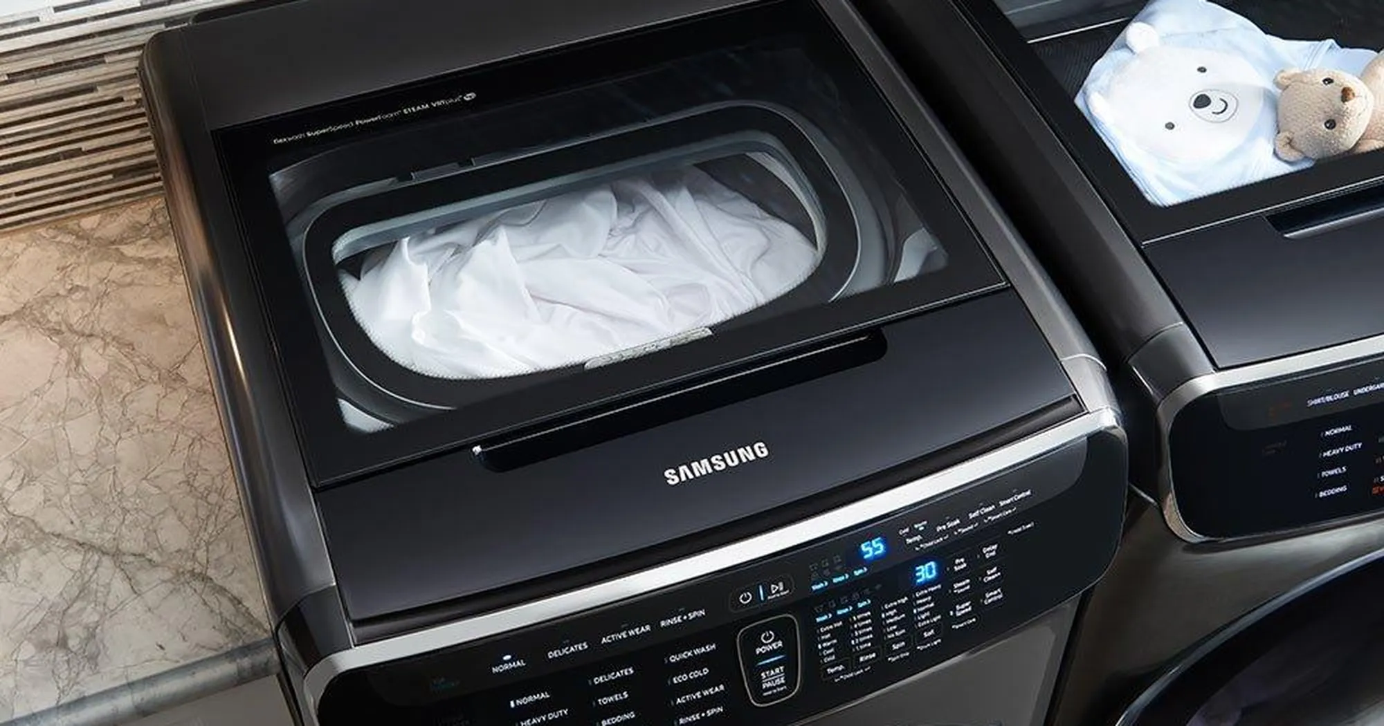 Two washers in one lets you wash separate loads at the same time, or independently. So if you just use the 1.1 cu.ft. upper washer for that one piece you need straight away, you can have it ready quickly. You can even run a dark wash and a light wash at the same time with no fear of colours running while keeping various types of clothes clean and in great condition. The 6.9 cu.ft. lower washer boasts 12 wash cycles including Delicate and Sanitize whilst the upper washer provides you with an additional 5 wash cycles as well as 7 additional options such as Extra Rinse and Self Clean.