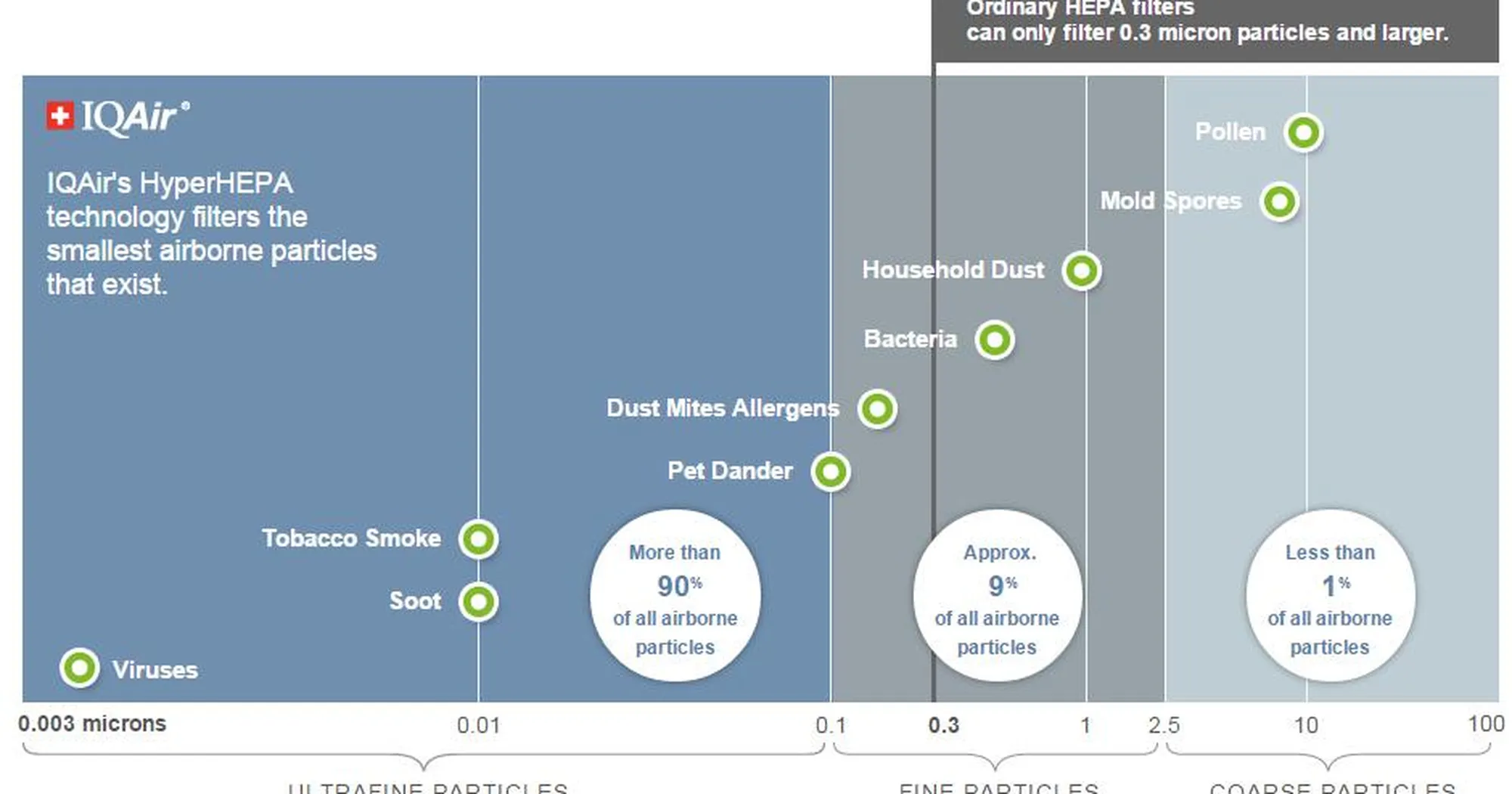 IQAir’s Health Pro Plus and Perfect 16 Whole-House Air Purifier can help eliminate unwanted airborne particles. While many air purifiers can filter particles larger than 0.3 microns, the IQAir-patented HyperHEPA filter can filter particles as small as 0.003 microns. The difference? Pet dander and dust mite allergens are approximately 0.1 microns, small enough to go undetected by a regular filter.